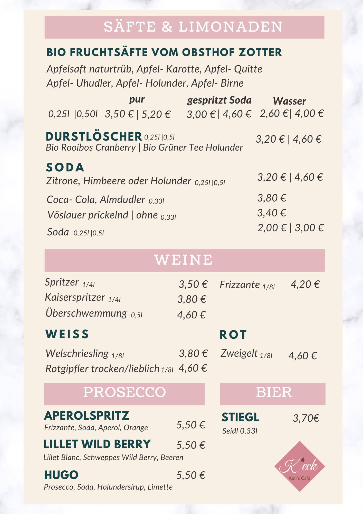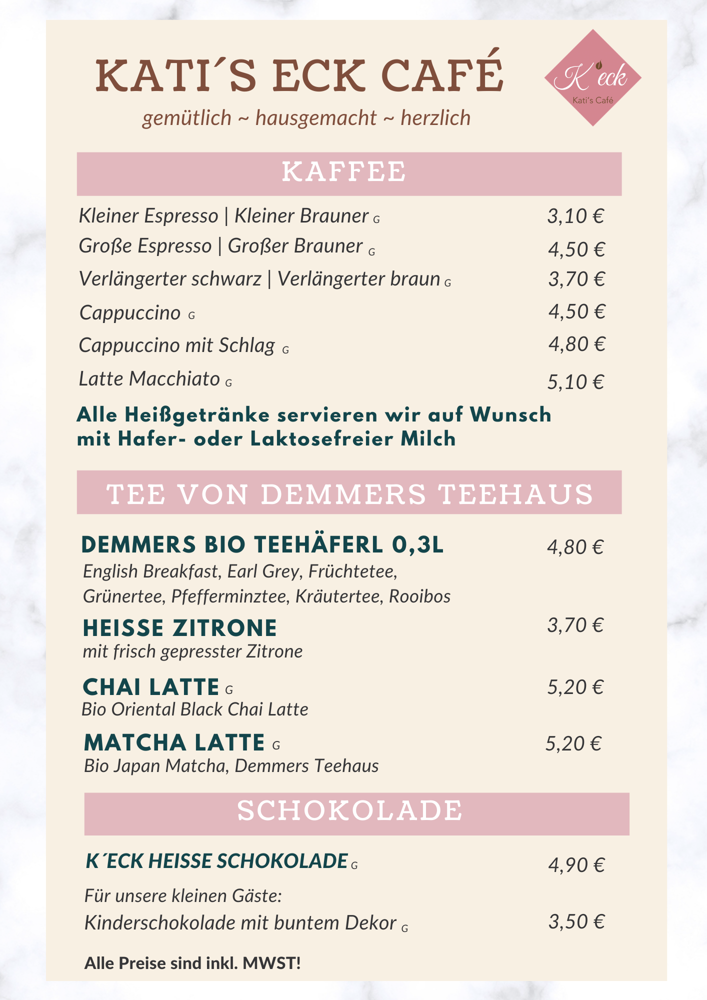 Wir haben eine große Auswahl an Getränken. Im Sommer verwöhnen wir dich mit einem kühlen und erfrischenden Eiscafé. Täglich gibt´s frische und hausgemachte Torten, die man sich auch gerne mit nach Hause nehmen kann. Hier kannst du unsere Karte ansehen.